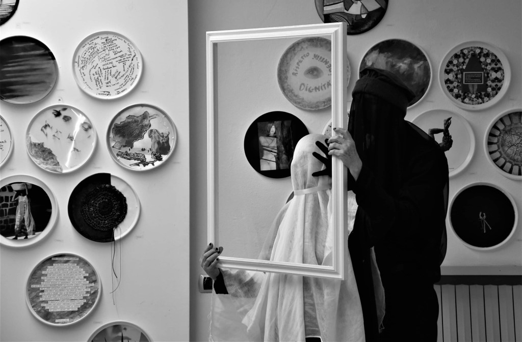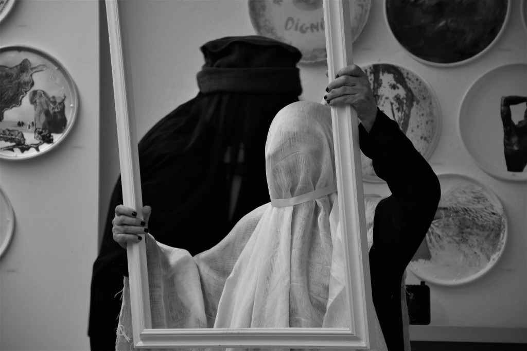 L’artista in questa azione si ispira al momento storico in cui vive la popolazione Afghana dopo l’avvento dei talebani. Divieti e proibizioni minano i diritti conquistati negli anni, riportando la storia del paese indietro nel tempo. Il gesto performativo si riduce a un’azione minimalista dove viene privata la vista, l’udito, l’ascolto, la discussione e l’incontro con l’altro.Apprezzata esponente nello scenario della cultura artistica in Italia e all’estero con particolare attenzione alle tematiche attuali. Emergono con estrema chiarezza le azioni di carattere universale con l’intento di favorire l’incontro con il grande pubblico con i linguaggi contemporanei.