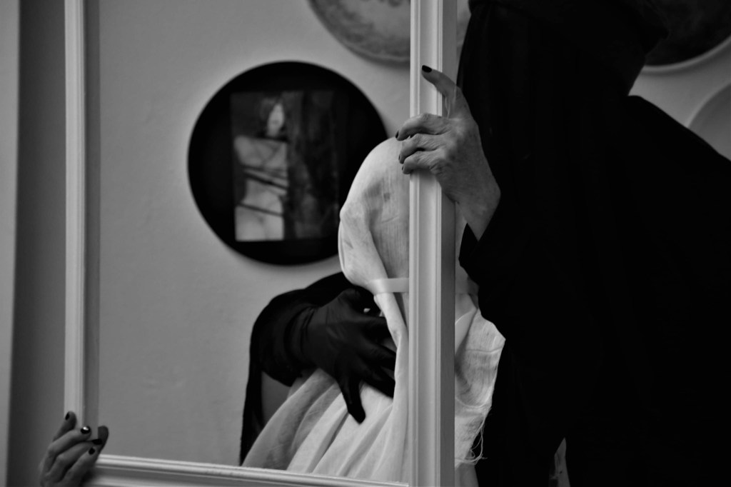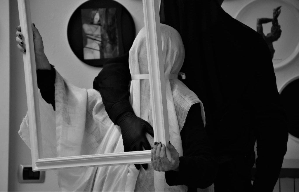 Proprio la bocca, orifizio, luogo dove esce la parola, dove entra l’ossigeno che ne alimenta il battito cardiaco attraverso la respirazione, ove il cibo pone il suo primo ingresso, come nutrimento per il corpo. Proprio la bocca, quale porta di ingresso e di uscita del corpo quale tempio sacro, come l’Oratorio retrostante. Proprio la bocca, ara delle della parola, interprete delle emozioni, esegeta dello spirito. Proprio essa, annerita da una maschera nera, mentre il corpo risplende come l’avorio, imponendosi allo sguardo, ostentandosi nella purezza, nella bellezza, nella sublime estetica dell’eleganza, nella gioconda rappresentazione della Luce.
