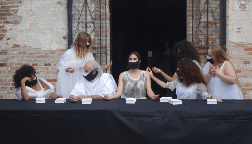 Dunque un corpo che parla, mentre la bocca tace nel convivio assente di vivande, ma presente di pensiero, di provocazione, di rivoluzione. Il Cenacolo rovesciato, messo “a testa in giù”, come “Le Pendu” – XII Arcano Maggiore – in cui al tavolo sono Donne, dodici, e un solo uomo in una sospensione immobile nel cui fulcro avviene una gestazione meditativa di attesa, di indugio, di amore; e il peccato si origina come fedeltà verso sé stessi; e la gentilezza scorre copiosa; e la notte diviene luce assente dal timore di essere frastagliata dal efferato giudizio di genere.